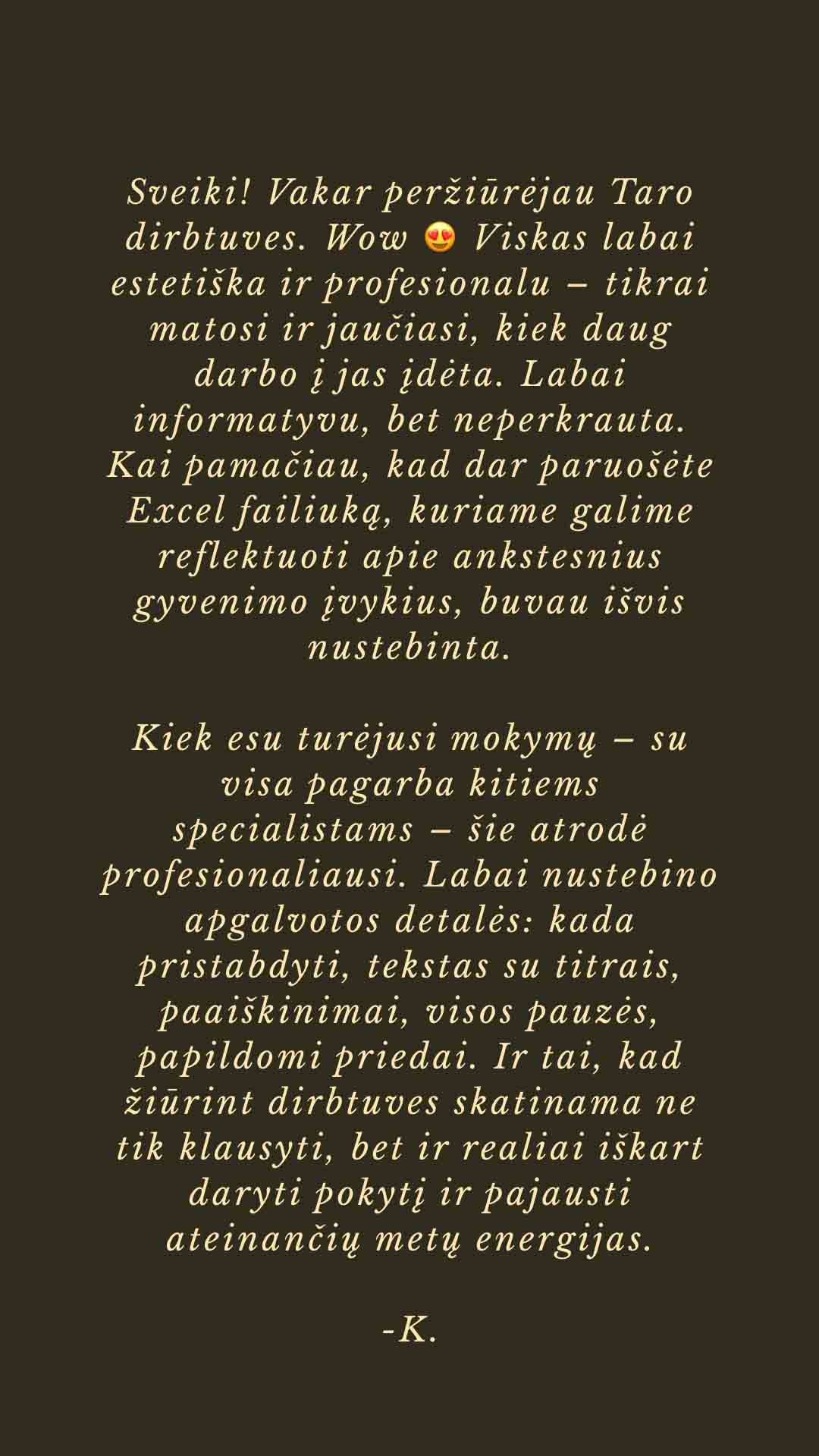 Sveiki! Vakar peržiūrėjau Taro dirbtuves. Wow 😍 Viskas labai estetiška ir profesionalu – tikrai matosi ir jaučiasi, kiek daug darbo į jas įdėta. Labai informatyvu, bet neperkrauta. Kai pamačiau, kad dar paruošėte Excel failiuką, kuriame galime reflektuoti apie ankstesnius gyvenimo įvykius, buvau išvis nustebinta.