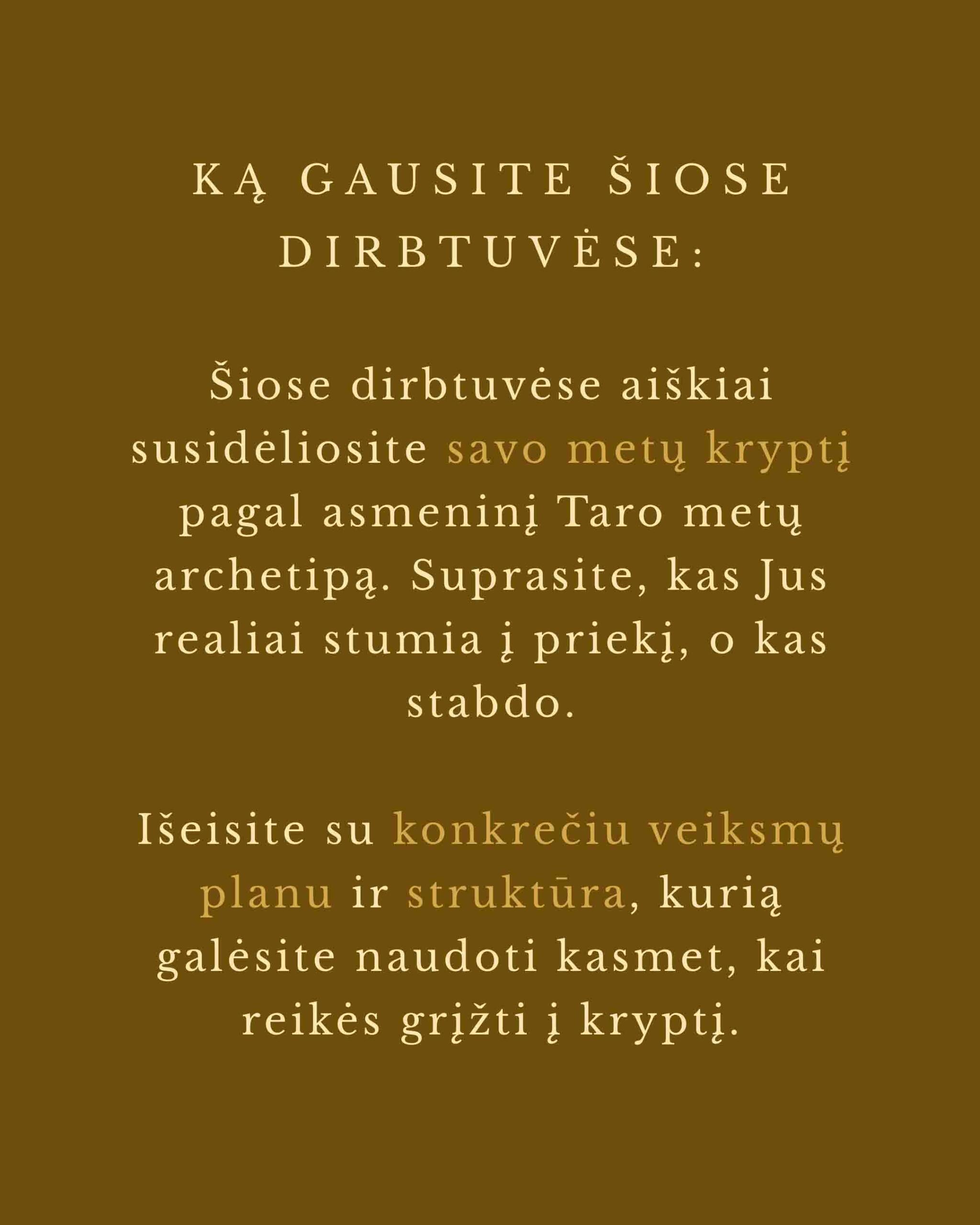 Toks Taro ir sąmoningos krypties kūrimo sujungimas nėra atsitiktinis ir jo niekur kitur nerasite. Tai bus stiprus, struktūruotas procesas. Išeisite su aiškia kryptimi, vidine laikysena ir praktiniu įrankiu, kurį galėsite naudoti ne tik ateinančius metus, bet ir kiekvieną kartą, kai jausite, kad prarandate kryptį.