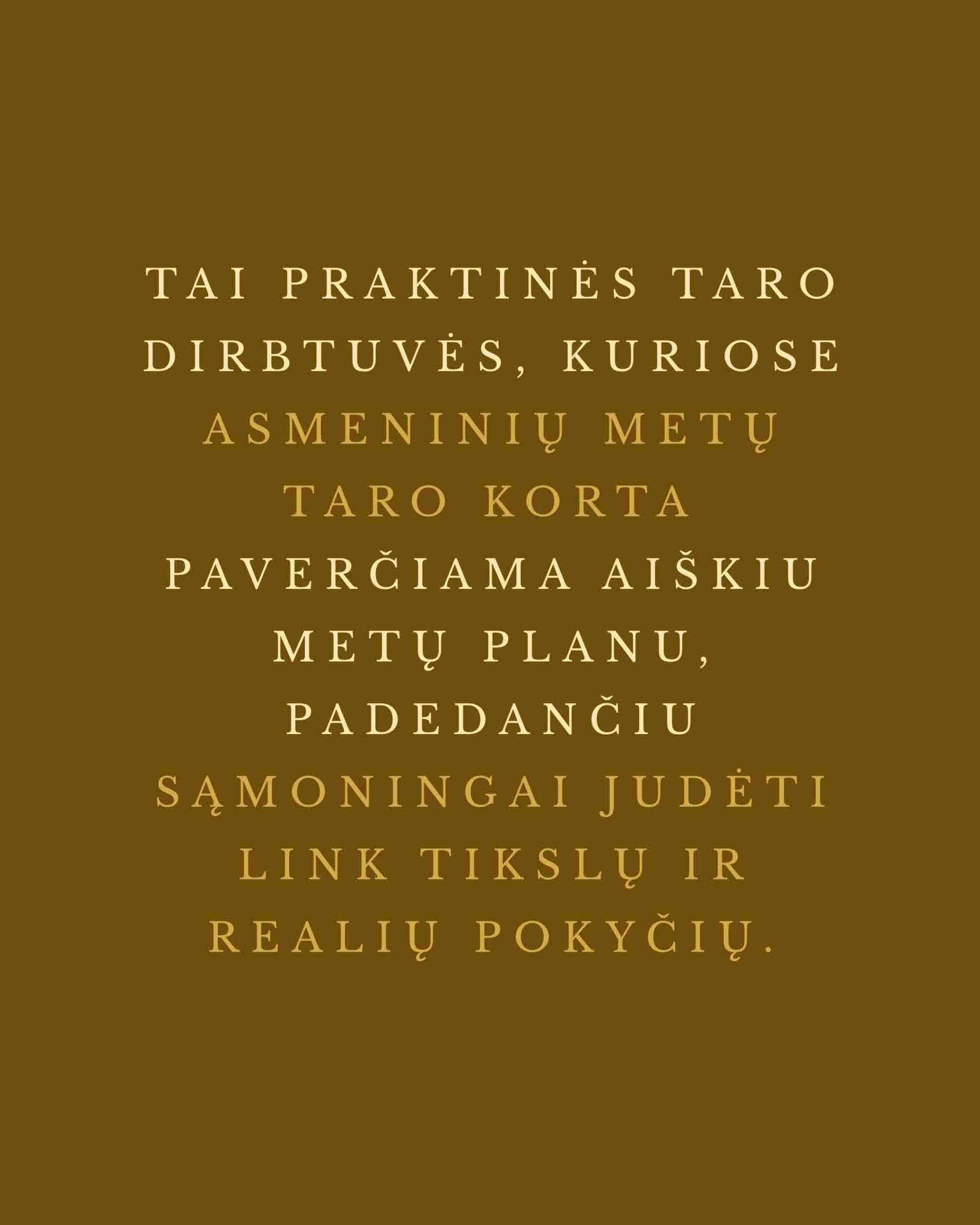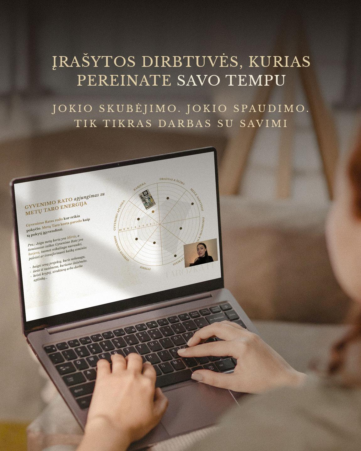 Tai įrašytos, kelių valandų trukmės praktinės Taro dirbtuvės, kurias galėsite pereiti savo tempu. Darbas su praktikomis užtruks ilgiau, tai sąmoningai palikau jūsų tempui.