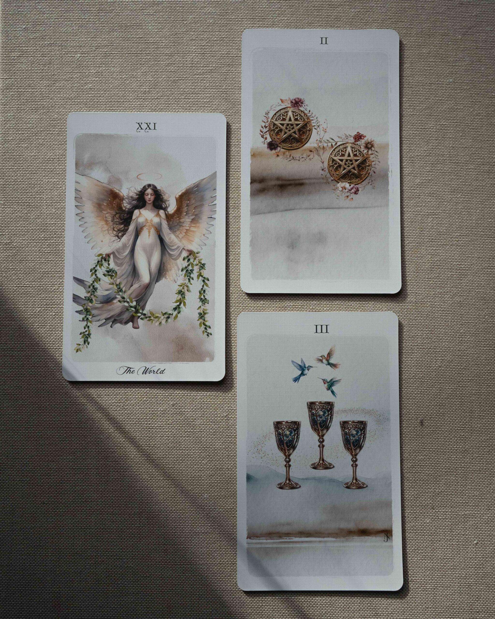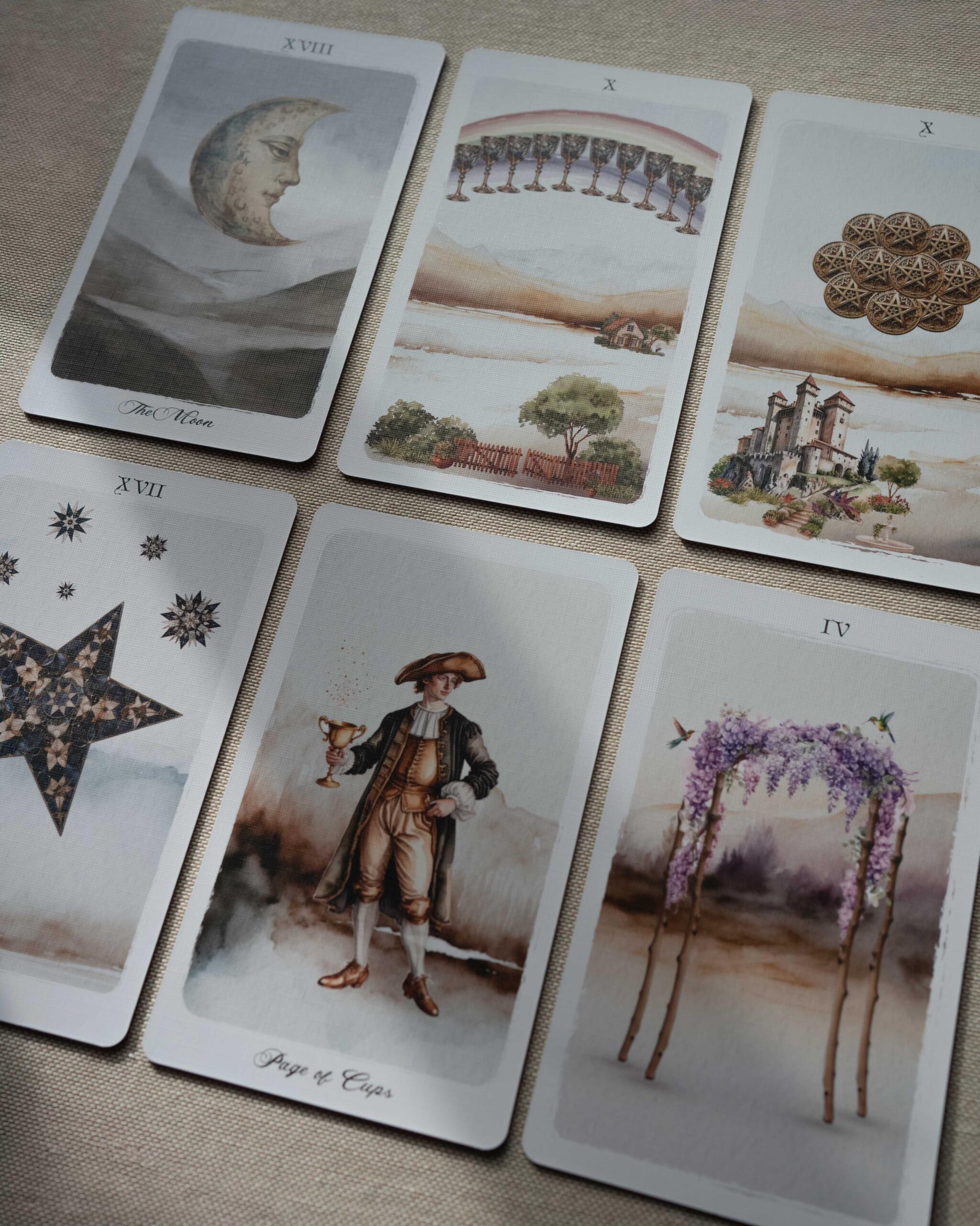 Taro kaladė, kviečianti sustoti ir įsiklausyti. Klasikinė Rider Waite sistema čia atsiskleidžia per švelnią akvarelės estetiką, alsuojančią raminančiais tonais.